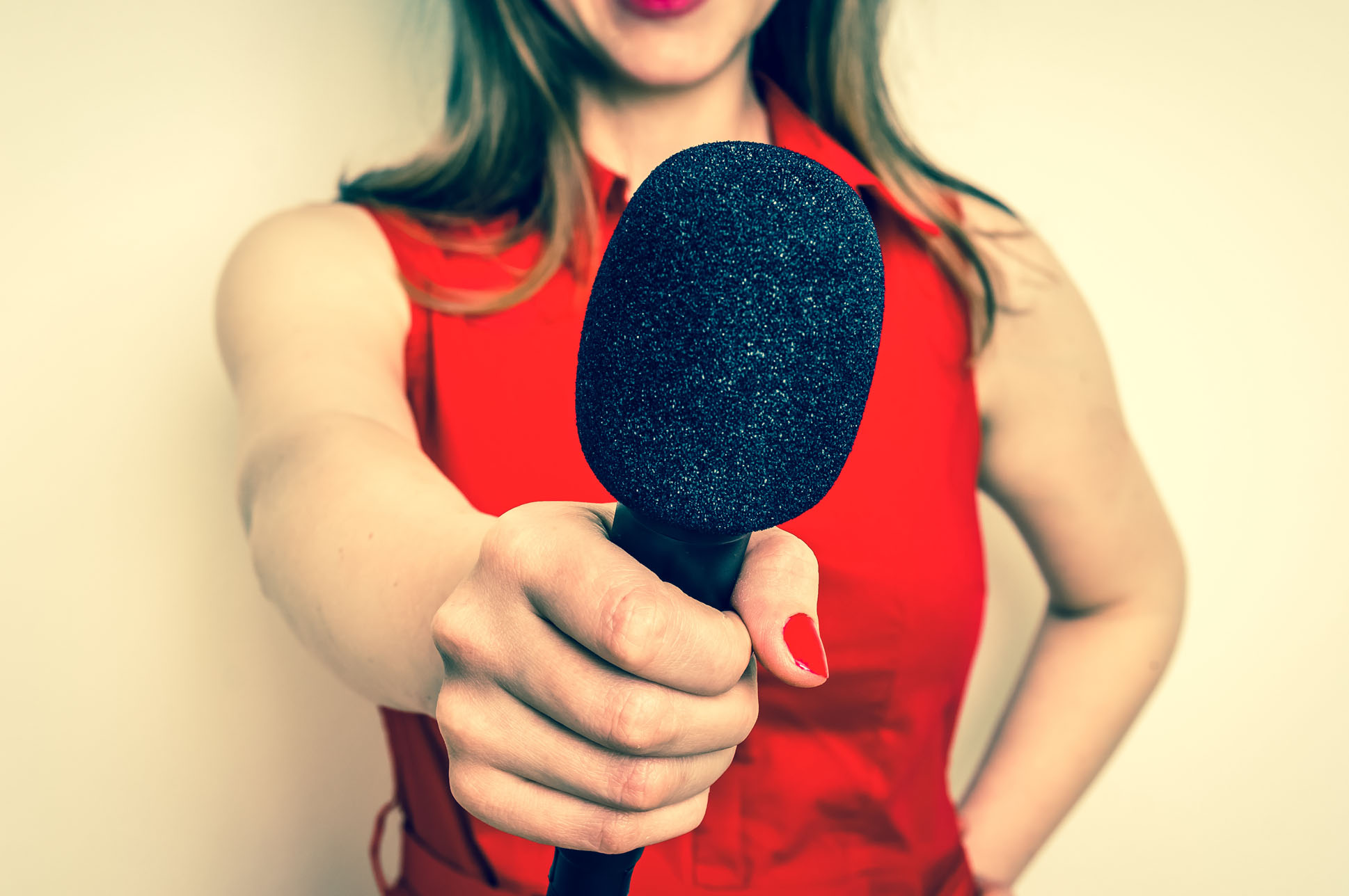 Female reporter with black microphone making interview – journalism and broadcasting concept